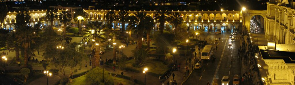 Arequipa: PLaza de Armas vista nocturna, by AgainErick – Own work, CC BY-SA 3.0, https://commons.wikimedia.org/w/index.php?curid=2959083